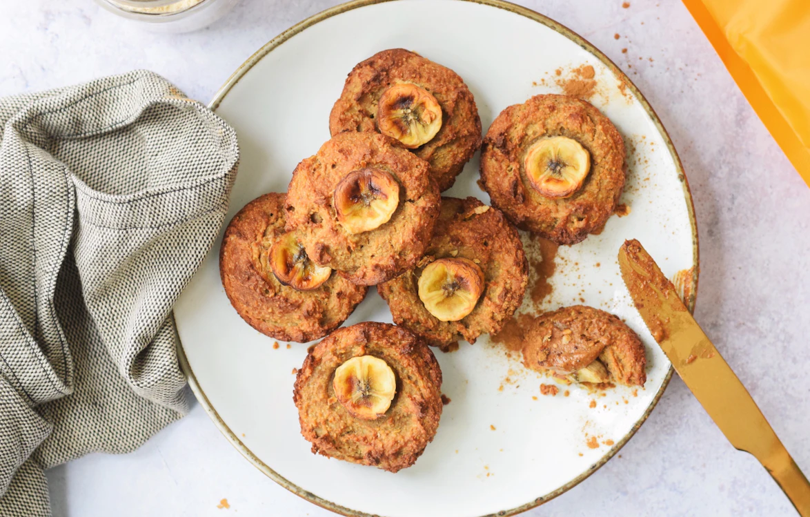 - Plaats een aantal plakjes banaan bovenop het beslag en plaats de muffinvorm voor 20 á 25 minuten in de oven.